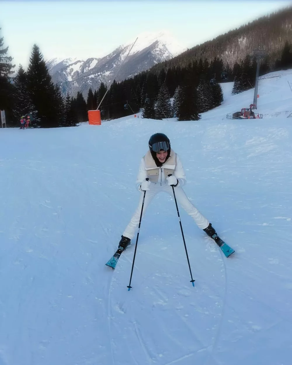 Рози известна своим изысканным чувством стиля, и даже на лыжах выглядела идеально. На протяжении отдыха модель носила несколько очень женственных горнолыжных комплектов: например, полностью молочный, с укороченной курткой и утепленными брюками клеш, а также серо-белый, с такими же брюками и бомбером в крупную клетку.