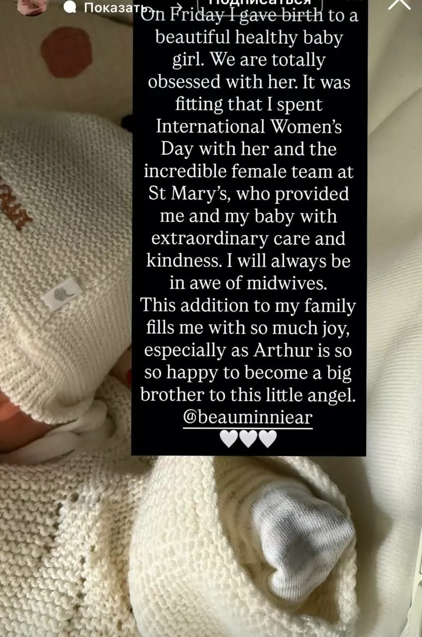 В эту пятницу у меня родилась прекрасная здоровая девочка. Мы просто без ума от нее, - написала певица. - Очень символично, что Международный женский день я провела с ней и с невероятной женской командой в больнице Святой Марии, которая окружила нас с малышкой невероятной заботой и добротой. Прибавление в нашей семье наполняет меня невероятной радостью, особенно потому, что Артур очень рад стать старшим братом этого маленького ангелочка.
