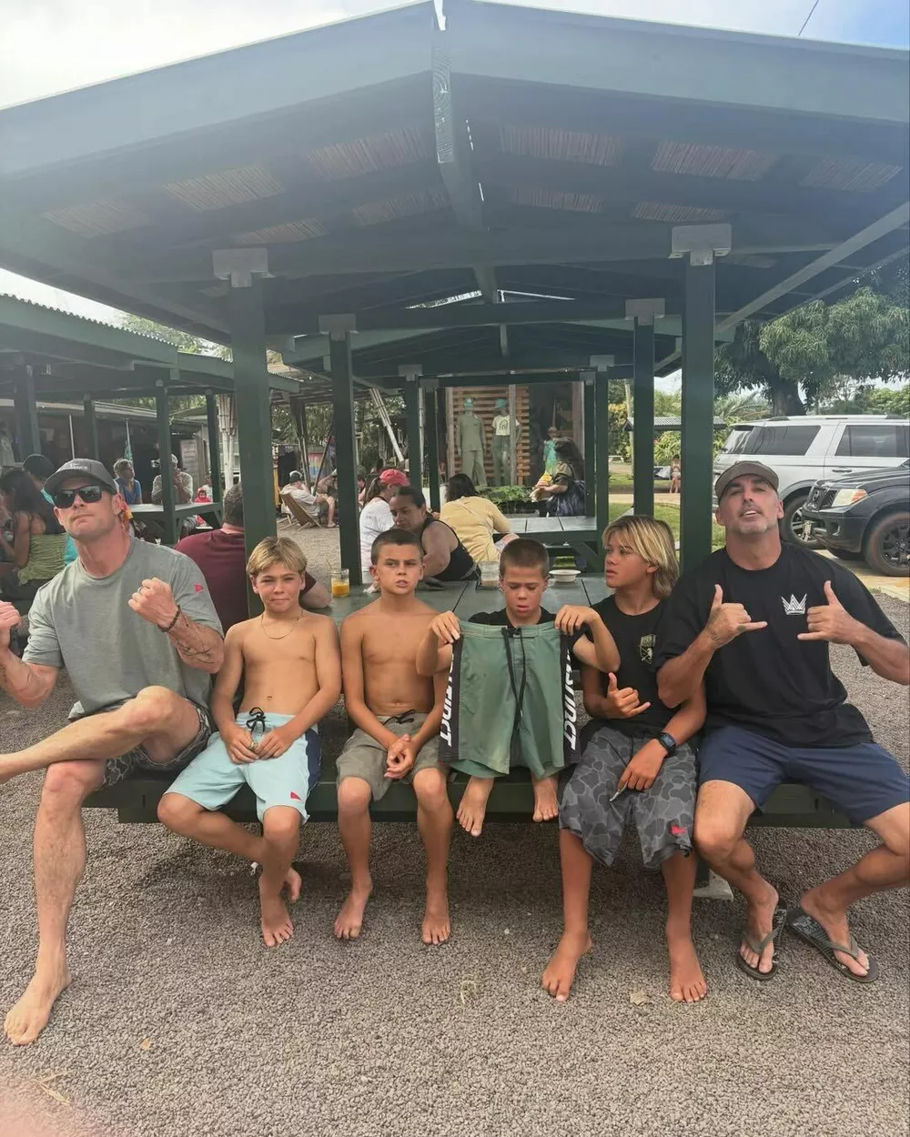 На побережье с семьей отправились и близкие друзья Хемсворта — другие отцы, объединенные со своими сыновьями общим увлечением. Старшая дочка Криса Индия Роуз, родившаяся в мае 2012 года, судя по всему, предпочла остаться дома с мамой.