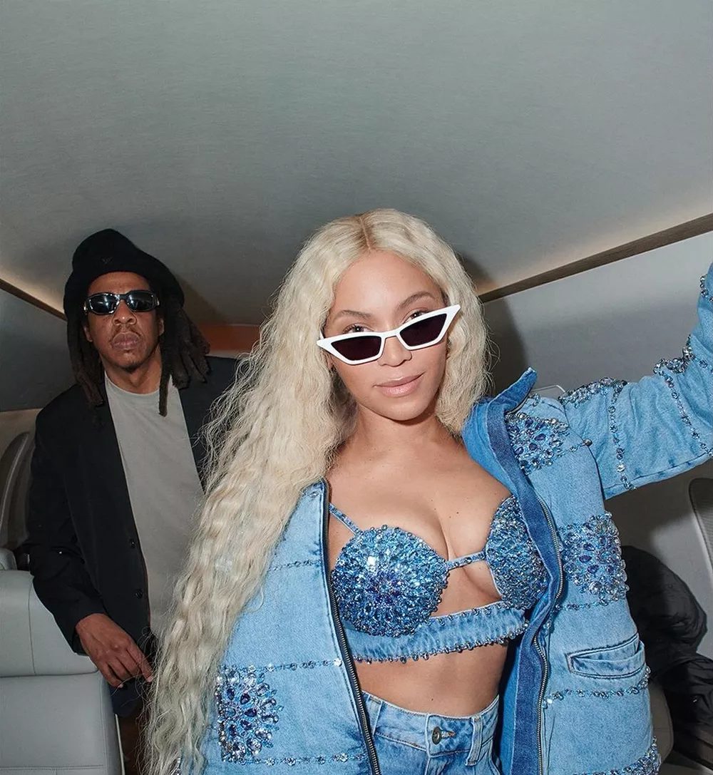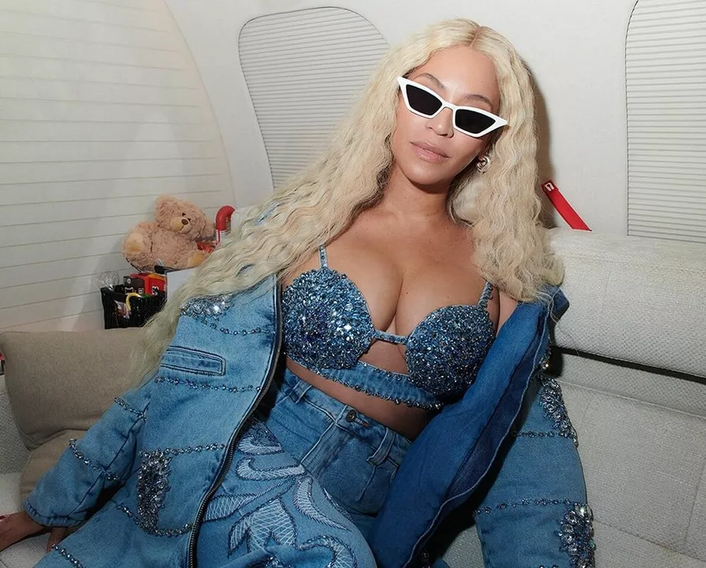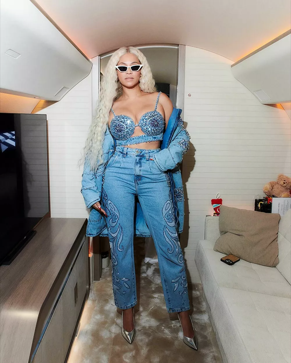 Перейти к новости: Бюстгальтер с драгоценностями и платиновые локоны: Бейонсе позирует в новом образе на борту частного самолета