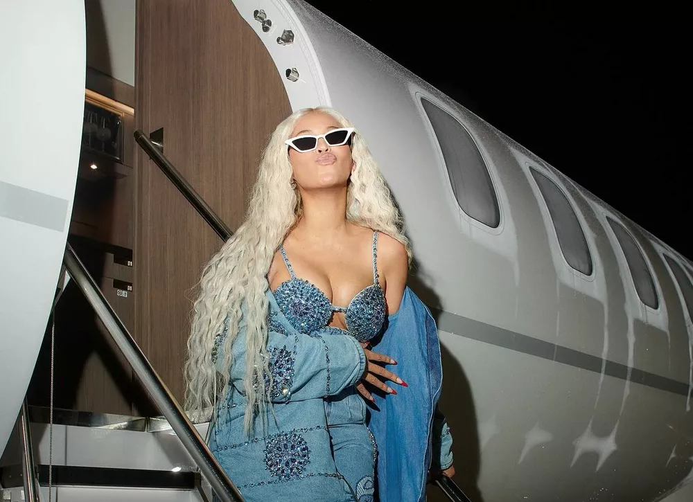Бюстгальтер с драгоценностями и платиновые локоны: Бейонсе позирует в новом образе на борту частного самолета