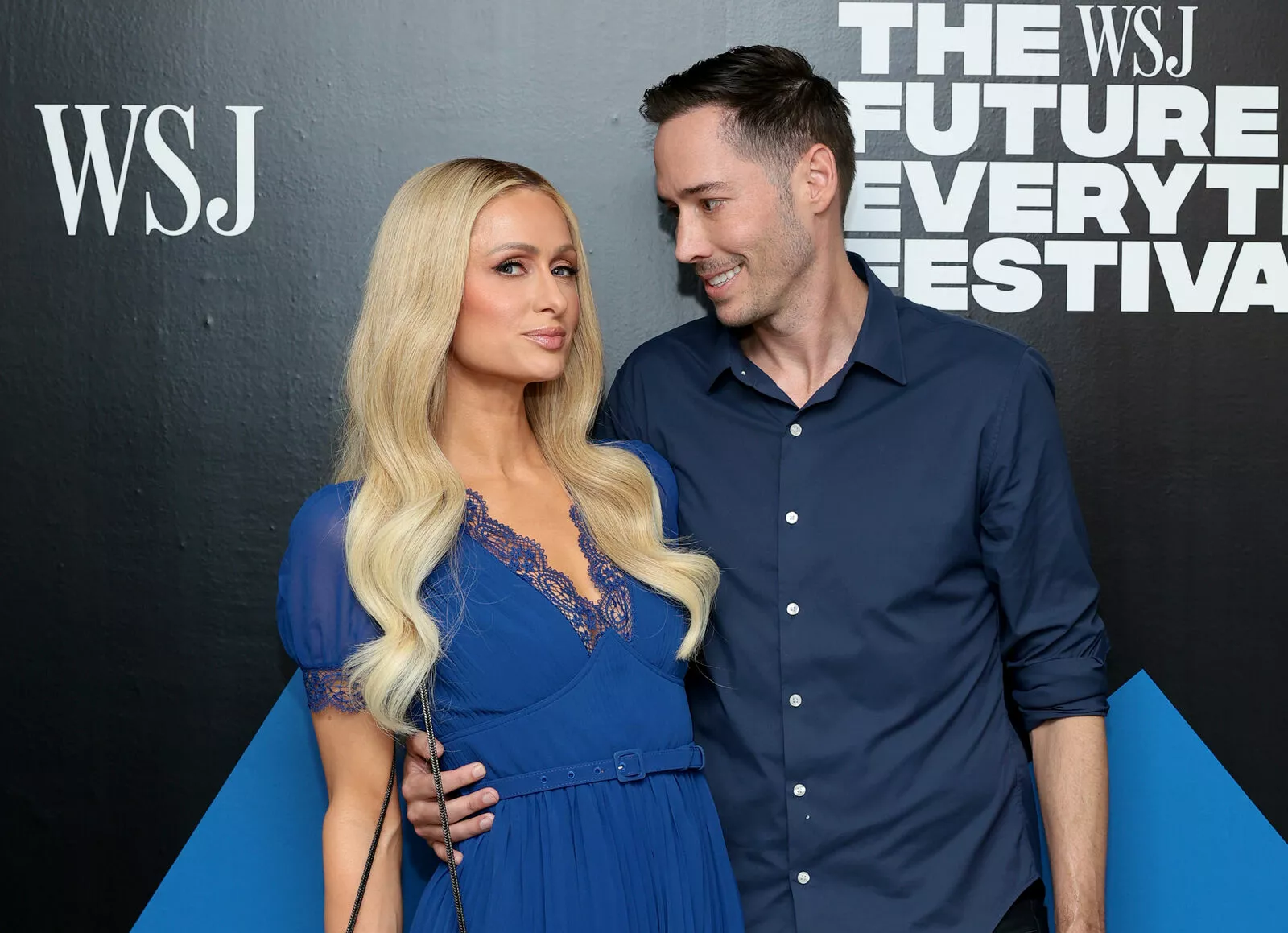 Пэрис Хилтон в небесно-голубом наряде с мужем на светском мероприятии