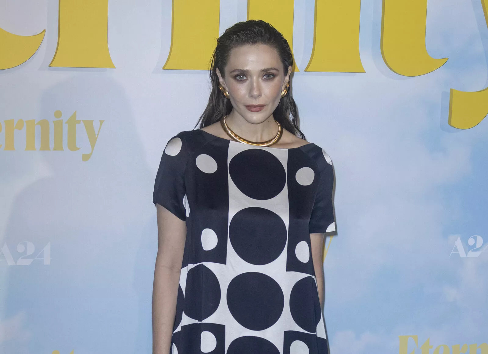 Перейти к новости: Образ дня: Элизабет Олсен в платье с геометричным принтом