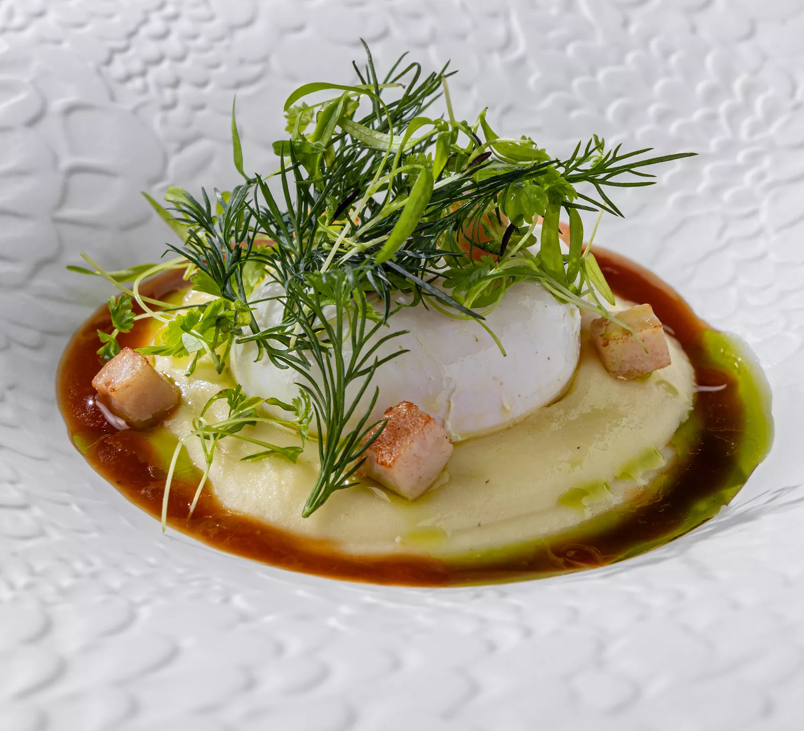 Картофельное пюре с яйцом пашот и индейкой