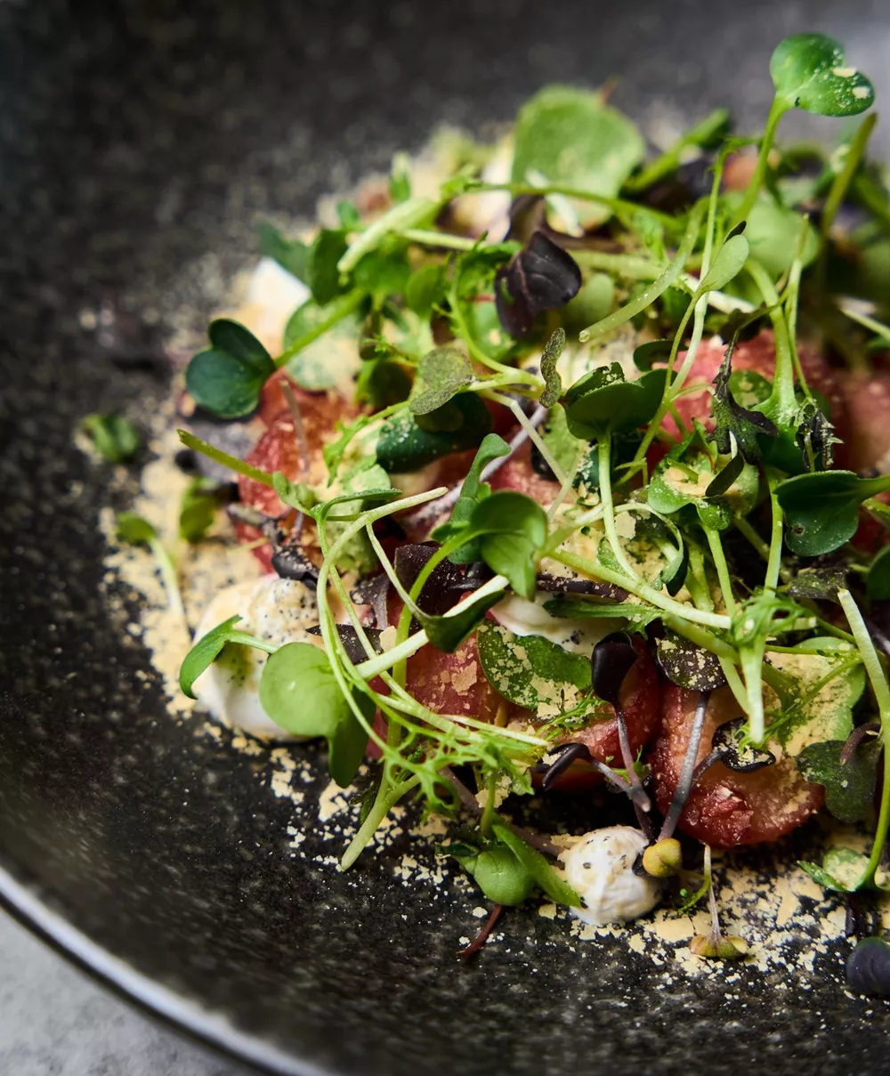 Жареный редис, постная сметана, пряная зелень
