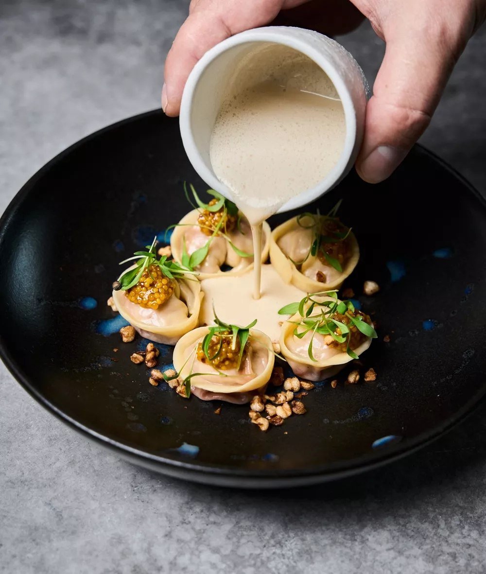 Пельмени с растительным мясом, миндальный соус, лаванда