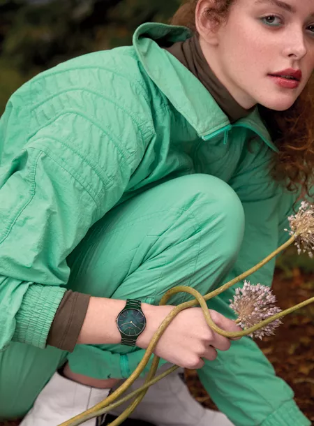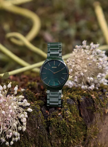 Rado True Thinline Leaf выполнены из высокотехнологичной керамики и обладают перламутровым переливающимся циферблатом зеленого цвета и изысканным узором структуры зеленого листка. Благодаря креативному сотрудничеству с Grandi Giardini Italiani — организацией, чья деятельность посвящена сохранению уникальных итальянских садов — эта серия часов является воплощением взаимосвязи природы и дизайна. Годы исследований и разработок воплотились в революционном керамическом корпусе-моноблок True Thinline — прежде недостижимой конструкции с использованием литой керамики, не требующей основы из нержавеющей стали. Эта технология не только позволила придать часам True Thinline невероятную легкость и утонченность, но и проложила дорогу новым дизайнерским проектам.
