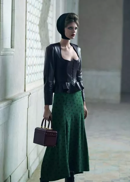Вдохновением для принтов послужили стиль ар-деко, элементы росписи изразцовой печи и любимые персонажи иллюстраций Васнецова. Изображения милых котиков и зайцев соседствуют с рисунками лесных грибов, яблок и ягод в обрамлении узоров, которые напоминают орнаменты изразцов. Традиционный для Дома цветок розы также встречается в принтах коллекции. Образы завершают шелковые косынки и платки, а также остроносые кожаные ботинки на каблуке. В новом сезоне линия аксессуаров пополнилась двумя яркими цветами сумки Natalia: теперь она представлена в красном и бордовом оттенках. Модели коллекции выполнены из таких материалов, как жаккард, жоржет, шелк, шифон, креп, бархат, шерсть, кашемир и кожа. В цветовой палитре доминируют различные оттенки красного, изумрудно-зеленый, коричневый, бежевый и черный.