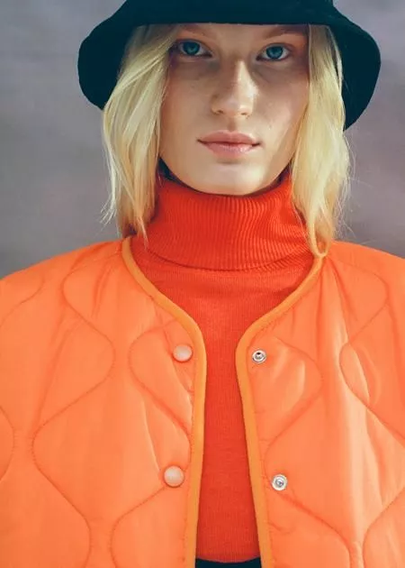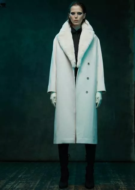 Цветовая палитра сочетает в себе нейтральные базовые (черный, бежевый) и яркие акцентные (оранжевый, зеленый, синий) оттенки. В коллекцию вошли стеганые куртки, тренчи из экокожи, жилеты, утепленные куртки, пальто и брючные костюмы.