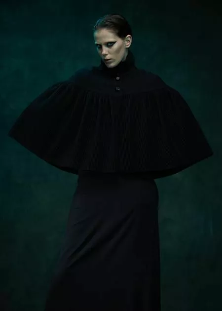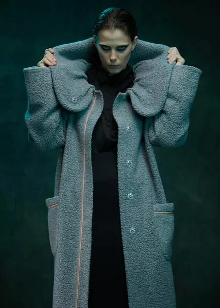Коллекция Tegin осень-зима 21/22 – это гармоничный симбиоз моды и кино. Светлана Тегин недавно дебютировала как художник по костюмам в многосерийном фильме "Вертинский", и ее работа, безусловно, отразилась и в новой коллекции бренда. Модели напоминают костюмы главных героинь фильма. Пелерина со сборкой и воротником стойкой – как у героини Виктории Исаковой, пальто с отстегивающемся меховым воротником – как у Анны Михалковой, прямые силуэты пальто – как у героини Паулины Андреевой.