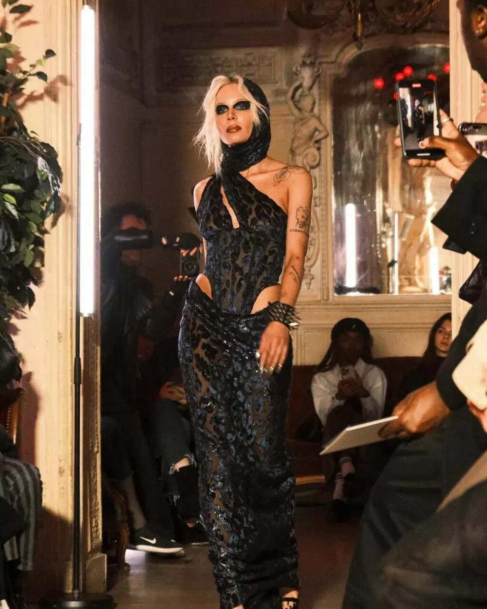 На шоу певица дефилировала в комплекте из полупрозрачного черного боди и юбки на бедрах с леопардовым принтом синего цвета. Эффектный образ дополнил яркий макияж в темных ягодных оттенках.
