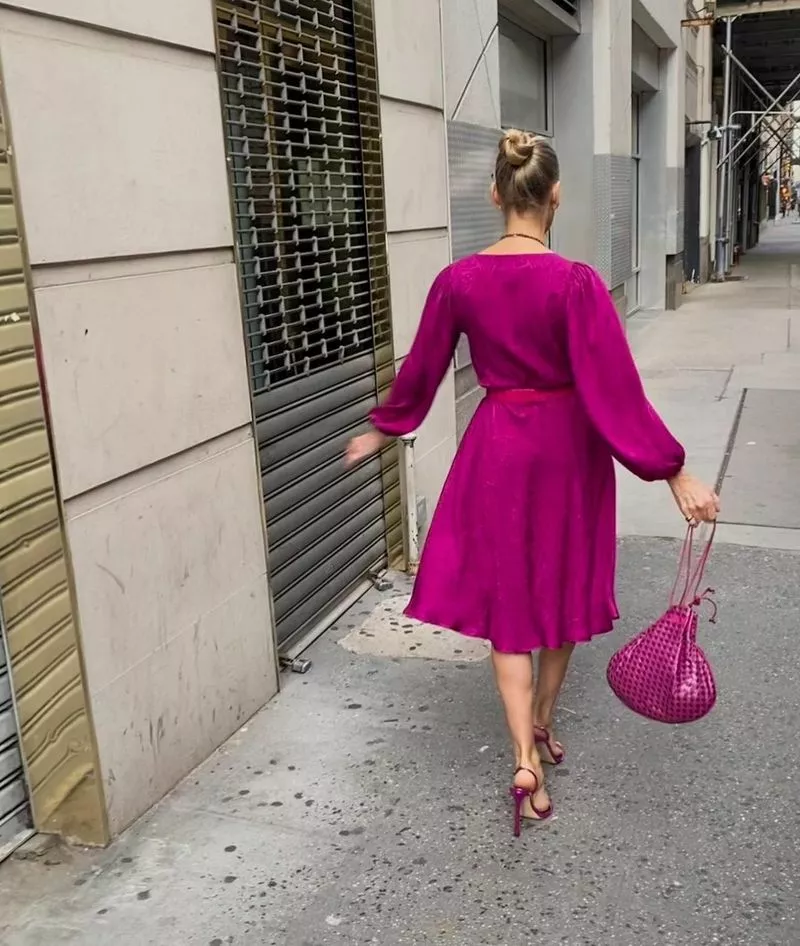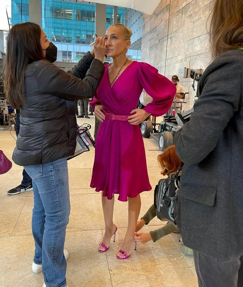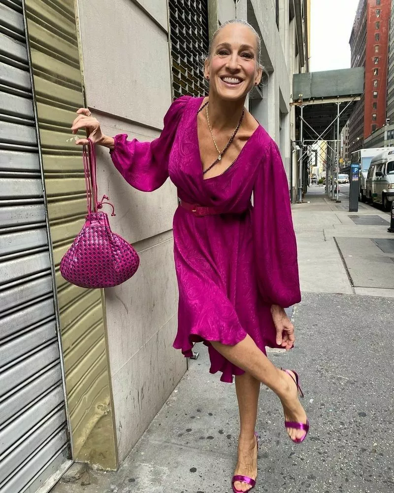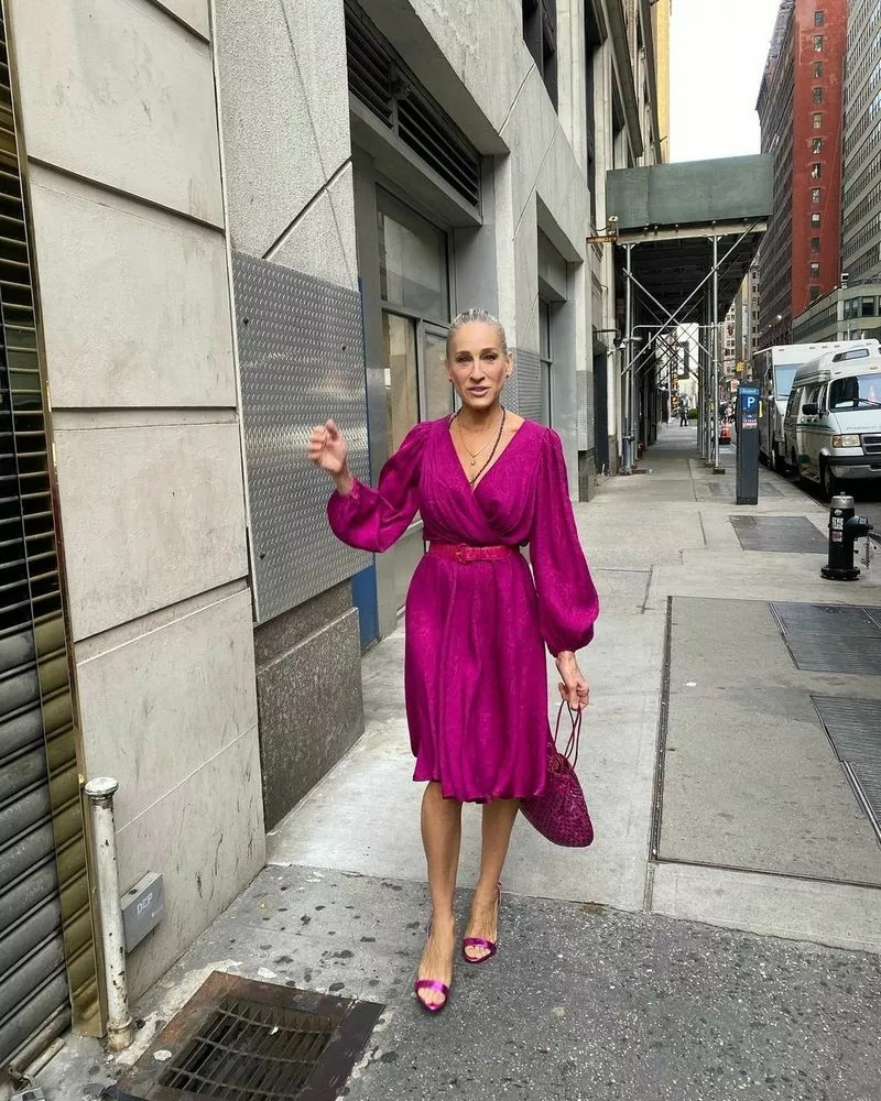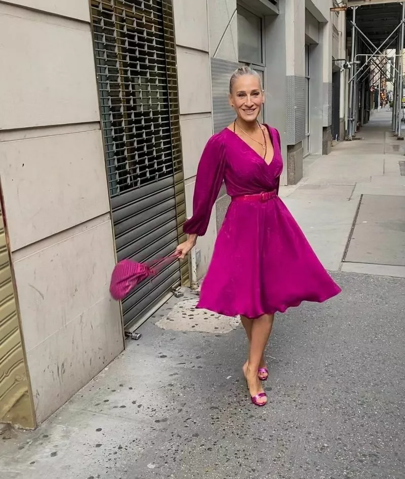 На фоне первого спорного костюма, в котором актриса появится на экране, из комбинезона с аксессуаром в виде сумки-голубя второй выглядит куда скромнее. 57-летнюю Паркер одели в винтажное платье цвета фуксии (с едва заметным принтом под названием "огурцы") с романтичными воланами по низу юбки, запахом и рукавами-фонариками. Дизайнеры костюмов сериала Молли Роджерс и Дэнни Сантьяго дополнили наряд розовым поясом, винтажной плетеной сумкой в виде мешочка и украшениями Danielle Greenblatt – серьгами-гвоздиками, кулоном-каплей на цепочке – и тонкими длинными бусами. Последним штрихом образа стали сатиновые босоножки в тон всему образу.