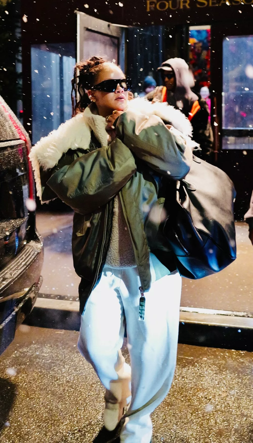 Рианну на этой неделе, 16 февраля, заметили на выходе из отеля Four Seasons в центре Нью-Йорка. Артистка носила безразмерный бомбер цвета хаки с белоснежной меховой отделкой, бежевый флисовый свитшот и джоггеры в оттенке светло-серый меланж.