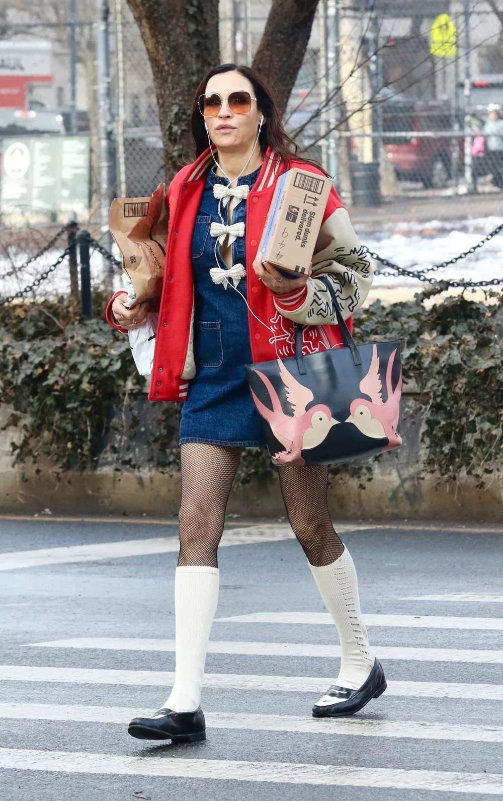61-летняя нидерландская актриса 17 февраля прогуливалась по центру Манхэттена в образе школьницы-бунтарки: она примерила джинсовое платье мини, бейсбольную алую куртку от Tommy Jeans x Keith Haring, двухцветные лоферы с белыми гольфами и сетчатыми колготками и сумку-тоут от Valentino с изображением розовых ласточек.