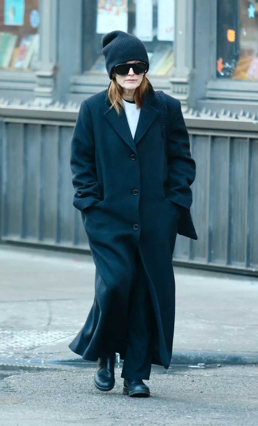 В отличие от коллеги Фамке Янссен, обладательница премии “Оскар” Джулианна Мур на своей ежедневной прогулке по городу 17 февраля попыталась остаться незамеченной, надев длинное черное пальто, массивные солнцезащитные очки и вязаную шапку-носок.