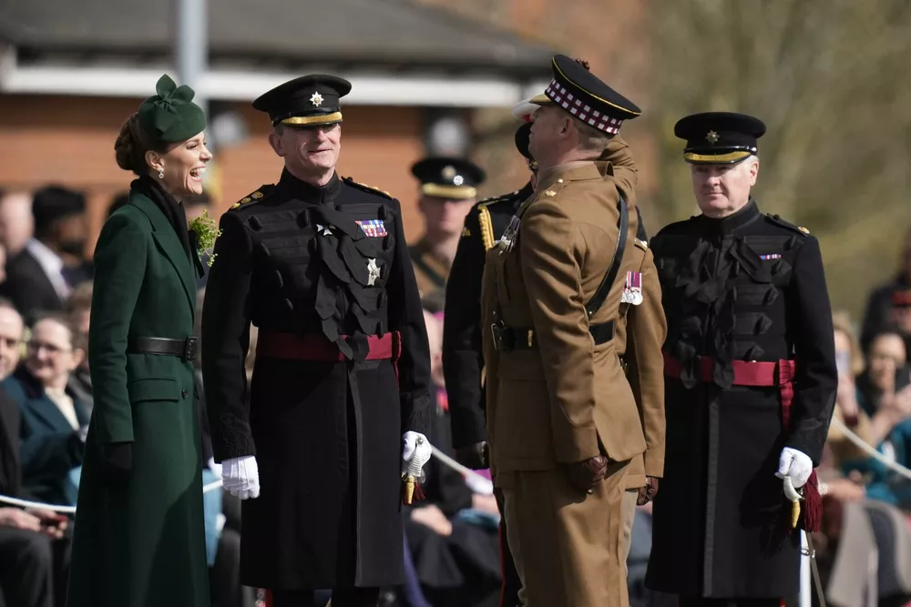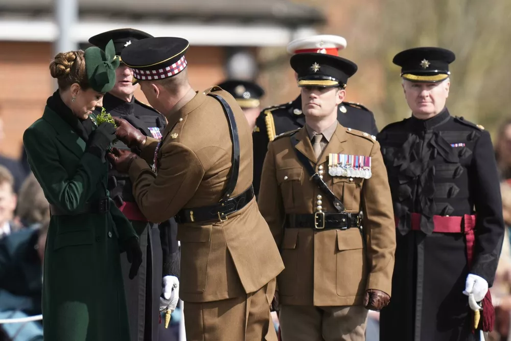 В сети появились первые фото Кейт Миддлтон с праздничного парада в честь Дня святого Патрика. Принцесса посетила 1-й батальон ирландской гвардии в казармах Монс в Олдершоте, графство Хэмпшир. Днем 17 марта Миддлтон прибыла туда с официальным визитом, но без принца Уильяма.