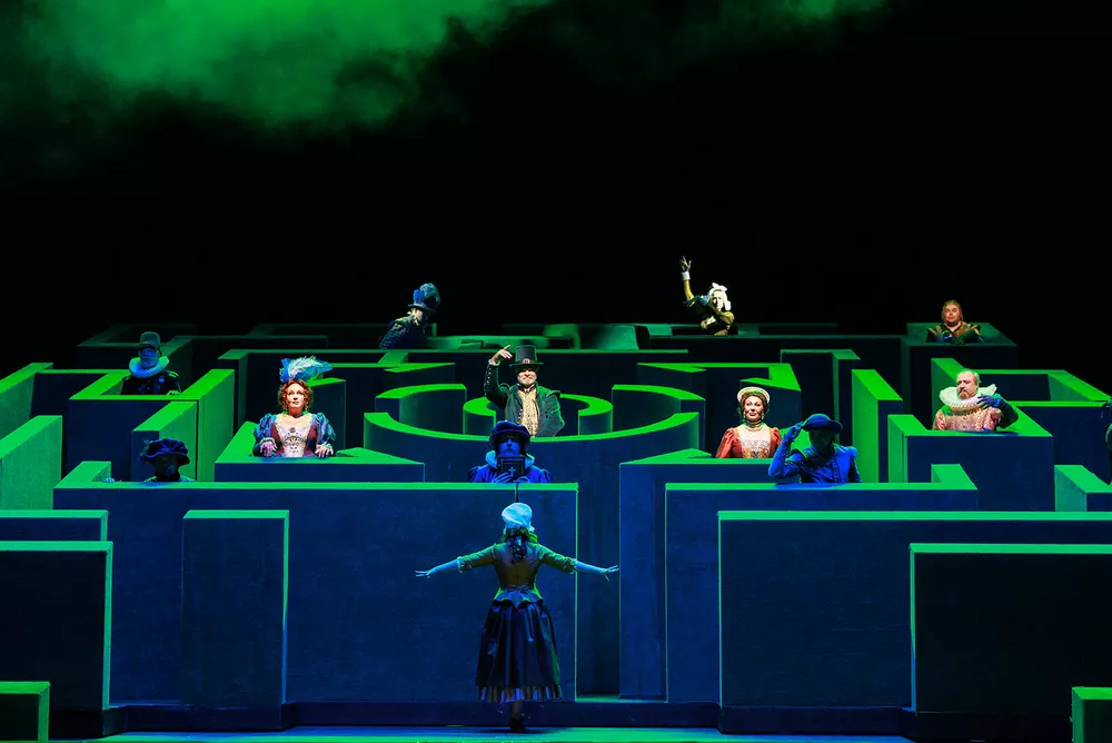 Жизнерадостный сэр Джон Фальстаф немного напоминает Остапа Бендера, но его методы оказываются крайне неудачными. Ведь женщин перехитрить невозможно! Сеть сюжетных линий сплетается из изящных интриг и комических поворотов, а события разворачиваются в зеленом лабиринте. Но героям, вовлеченным в наивную и безобидную шутку, все-таки удается найти выход из путаного пространства. В главной роли мирового репертуара — народный артист России Александр Клюквин, в роли виндзорских кумушек — народные артистки России Светлана Аманова и Людмила Титова.