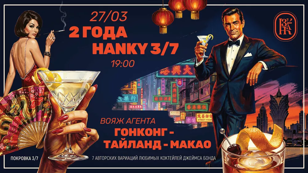 Азиатские маршруты специального агента вдохновили организаторов вечеринки по случаю второго дня рождения бара. Как мы помним, Джеймс Бонд постоянно что-то выпивает по ходу дела, и эти коктейли, становясь легендарными, входят в карты всех баров мира. Вот и команда Hanky 3/7 подготовила твисты на 7 напитков, так или иначе ассоциирующихся с вселенной Яна Флеминга. Названия авторских версий многообещающие: “Лицензия на убийство”, ”Восточный экспресс”, ”Спектр”... Выбранная тема очень соответствует концепции бара – с отсылками к Гонконгу, британской барной культуре и кинематографичностью подачи.