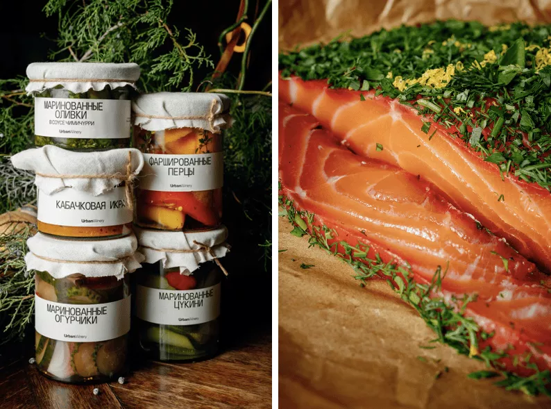 От современной городской винодельни Urban Winery к празднику приедет идеальное сопровождение под вино, которое подается обычно в самом ресторане: домашняя кабачковая икра (450 руб.), маринованные огурчики с хересом (890 руб.) и маринованные цукини (490 руб.), которые входят в рустикальный бургер из меню, маринованные в чимичурри оливки (990 руб.), фаршированные перцы (1250 руб.) и домашний паштет из кроличьей печени со сливовым вареньем (1200 руб.). Все это закатано в банки и может спокойно подождать своего застольного часа даже без холодильника. А с 25 декабря можно заказывать свежеприготовленные блюда, которые шеф Арина Журавлева предлагает на новогодний стол: оливье с кроликом и сальсой из креветок и мандаринов (2800 руб. за 1 кг), слабосоленый лосось в травах (5500 руб. за 100 г), а также удивительно нежный “Наполеон” с солью (2250 руб. за 1 кг).