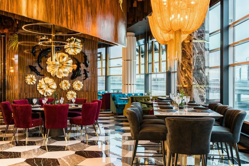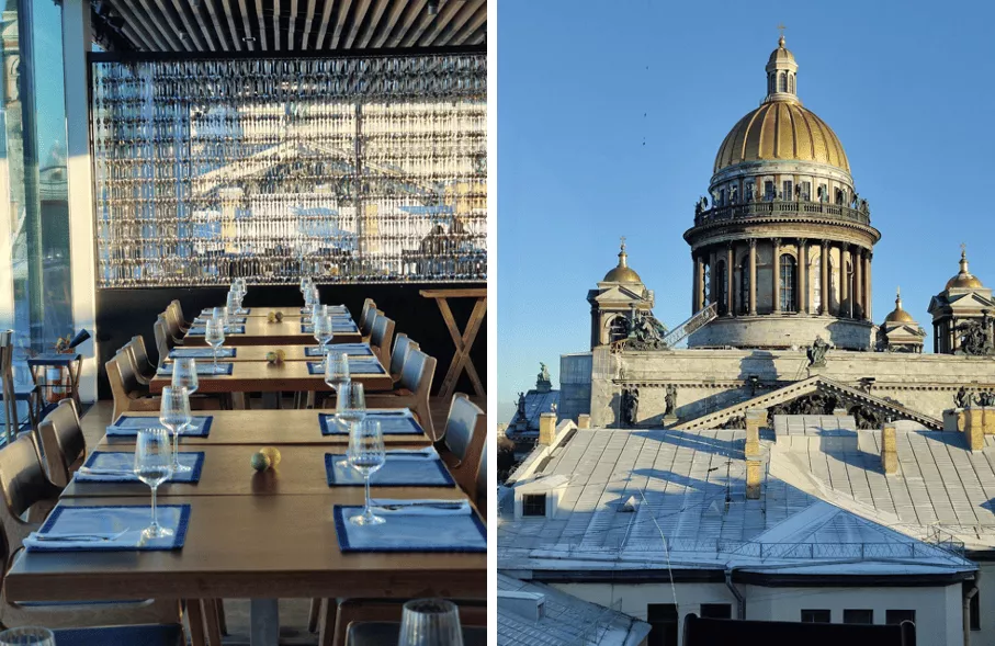 Из панорамных окон известного всем гурманам ресторана открывается такой туристический вид, что закачаешься! Сидя буквально под крышей современного делового комплекса, основную часть которого занимают офисы крупнейшей энергетической компании страны, можно увидеть и аутентичные питерские крыши, и купол Исаакиевского собора во всей его красе. Наслаждаясь, закусками в средиземноморском стиле и авторскими роллами, пиццей на тончайшем тесте и отборными row-морепродуктами, идеальными стейками dry age и креативными десертами, можно детально осмотреть с довольно близкого расстояния колоннаду, скульптуры и даже один из горельефов на обращенном к вам фронтоне. Помимо впечатляющих видов со знаменитой открытой террасы или из зала, в самом ресторане тоже есть что поразглядывать – интерьер наполнен множеством декоративных элементов, привлекающих внимание. Например, висячая перегородка из сотен блестящих ложек, окруженные пышной зеленью кресла в барной зоне, эффектные светильники, да и сама обстановка в целом, отсылающая к яхтенному дизайну, буквально зовет немедленно фотографироваться!