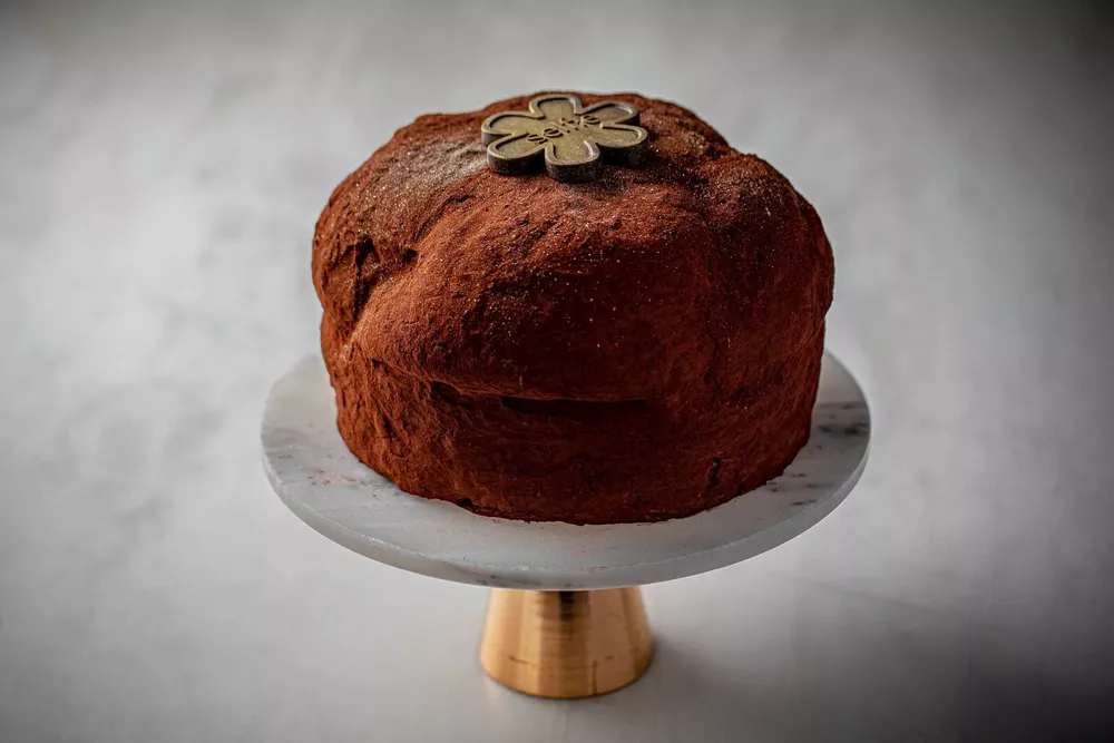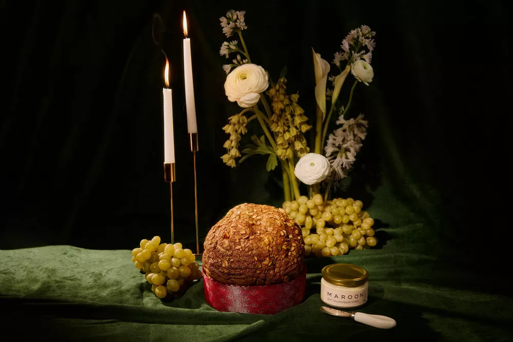 Панеттоне из ресторана Аркадия Новикова Maroon (18000 руб.) сопровождается баночкой нежного фисташкового крема и фирменным ножом для его намазывания – вероятно, тут звучит отсыл к нашему куличу и творожной пасхе, но в более «южной» версии. Тесто приготовлено на традиционной закваске Левито Мадре и щедро сдобрено цукатами апельсина, грейпфрута и лимона, дроблеными карамелизированными фисташками, карамельным и фисташковым шоколадом (привет Дубаю!). Покрыт панеттоне глазурью на основе фундучной муки, белка и сахарной пудры и лепестками фисташки. Для последователей русской пасхальной традиции в Maroon также испекли куличи на дрожжевом тесте, с кремовой начинкой и красивым авторским декором (5400 руб.).