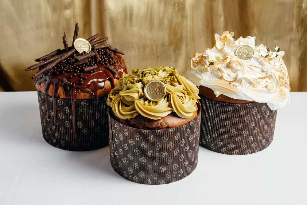 В пасхальной коллекции ресторана Peach – три итальянских панеттоне с начинкой: лимонный с меренгой и курдом, фисташковый с кремом и шоколадный с ганашем. Если мучаетесь выбором, можно купить ассорти из трех мини-куличиков, а центром праздничного стола сделать пасхальное яйцо. В ассортименте – Absolute из темного шоколада с золотой поталью и трюфельными конфетами, Peach Edition c начинкой из шоколадного ганаша, соленой карамели, вафельного слоя и фундука, а также Sakura Blossom и Tiffany Lavender с соответствующими названиям начинками.