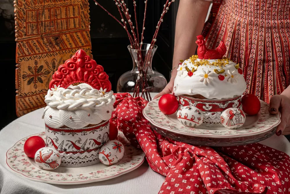 В ресторане Александра Раппопорта «Воронеж», во владениях шеф-кондитера Александра Солонина следуют исключительно русским традициям: куличи готовят вручную, из сдобного теста на сливочном масле, с апельсиновой цедрой и цукатами из вишни и клюквы, вымоченными в апельсиновом соке с коньяком. Помимо белковой глазури куличи украшаются либо трендовым кокошником из шоколада, либо красной курочкой, а на крашеные яйца, идущие в наборе с куличом, и на обечайку наносится авторская мезенская роспись. Все собрано в красивую коробку, прямо в которой можно либо отнести угощение в церковь для освящения, либо сразу поставить на стол, либо преподнести в качестве подарка.