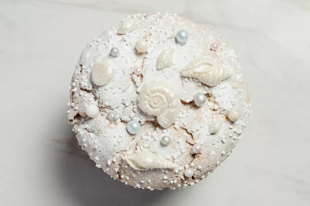 Бренд-шеф-кондитер ресторана «Тэму» Фатима Салех тоже будет готовить классические панеттоне с апельсиновыми и лимонными цукатами, ванилью, вымоченным в роме изюмом и цедрой апельсина (3500 руб.). А благодаря декору панеттоне получаются словно сокровища со дна морского – в рисовых жемчугах в шоколаде, с шоколадными ракушками и жемчужным сахаром. Глазурь у этой версии куличей особенно стойкая, так как к белкам и сахару Фатима добавляет миндальную муку и кукурузный крахмал.
