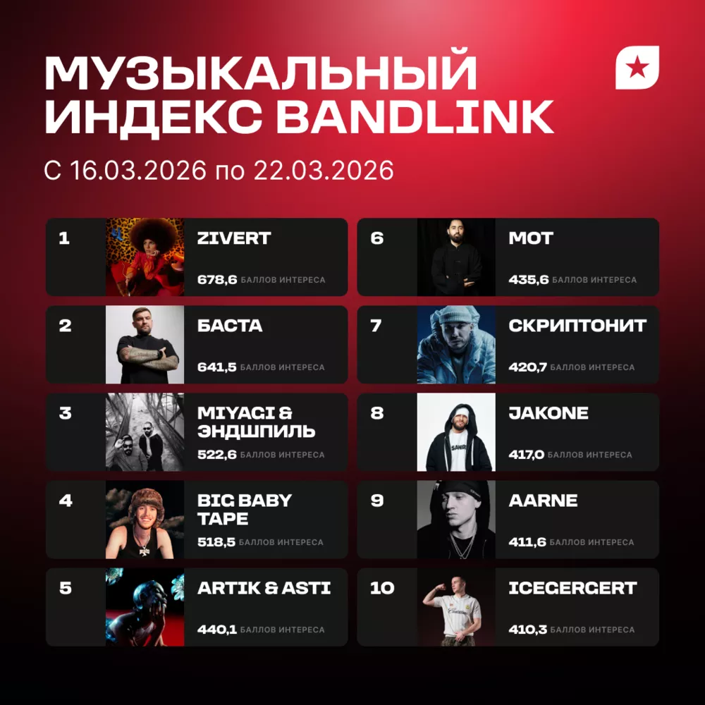 Примечательно, что с момента запуска аналитического инструмента BandLink в декабре 2025 года Zivert стабильно удерживалась в топ-10 списка. А на неделе с 16 по 22 марта артистка совершила резкий скачок: поднялась с 3-го на 1-е место, набрав 678,6 балла — на 92,9 больше, чем неделей ранее.