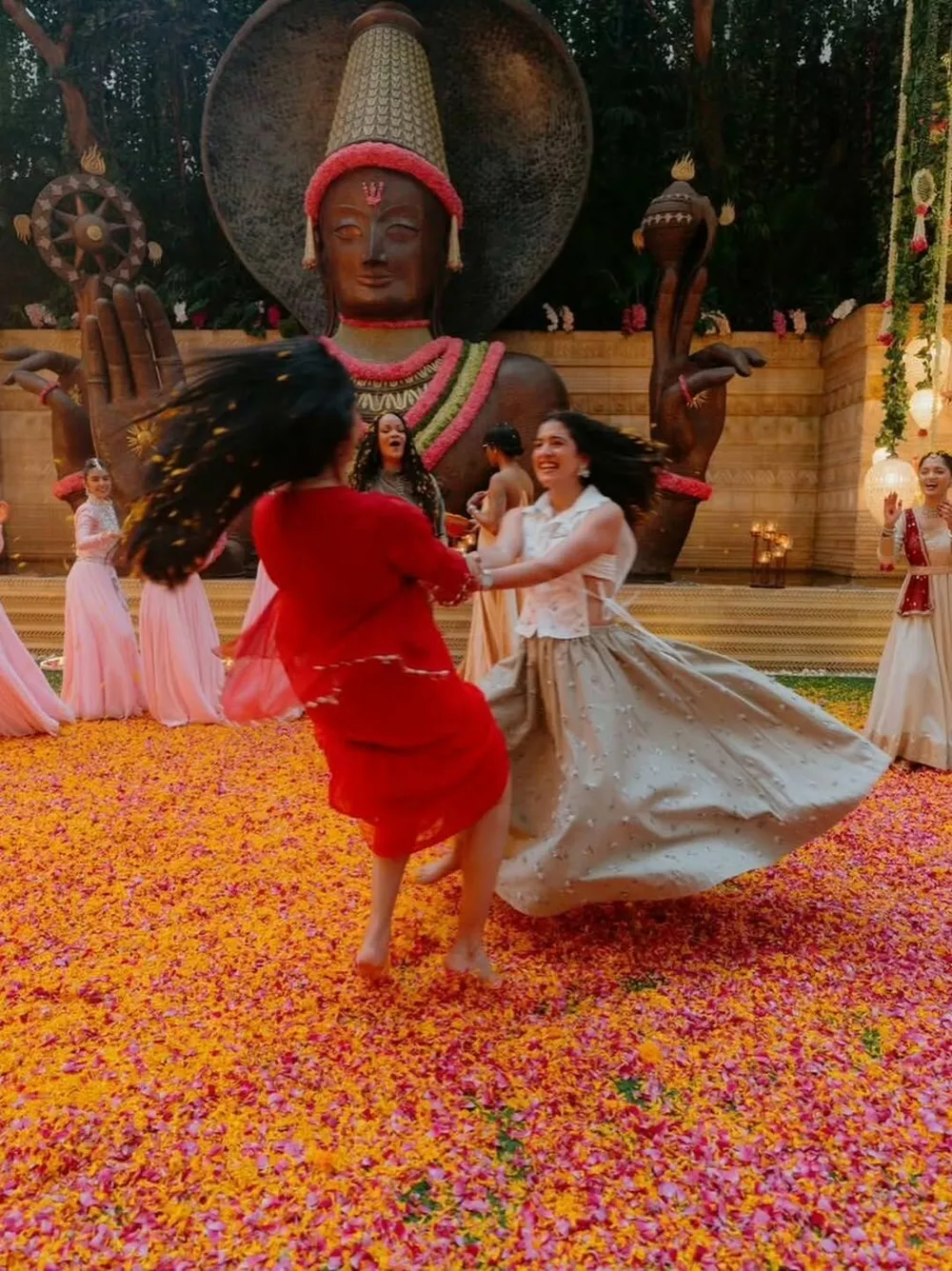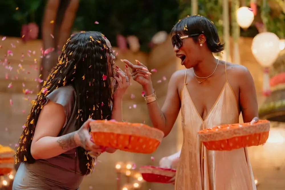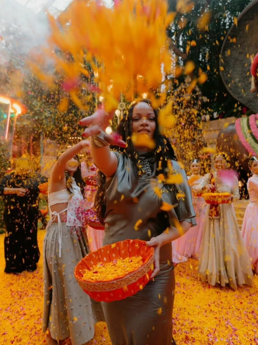 Фотографии с мероприятия демонстрируют, что Рианна была единственной гостьей на обеде. На снимках артистка участвует в традиционной индийской церемонии Пуджа, которой удостаивают особо почетных гостей, а также присоединяется к фестивалю красок.