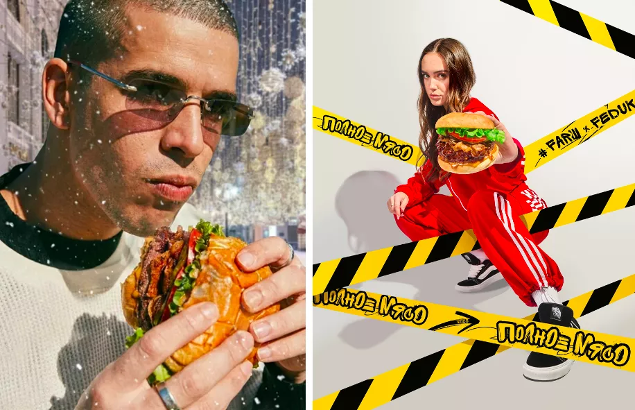До 5 февраля в любой из бургерных #FARШ можно попробовать самый мясной бургер от FEDUK (1250 руб.). Коллаборация популярных бургерных и не менее популярного рэп-исполнителя называется “Полное мясо”: толстенная мираторговская котлета рибай и бекон из мраморной говядины в специальном мясном стейк-соусе дополнены свежими овощами и соусом “Копченая карамель”. Вся эта сочная роскошь заложена в картофельную булочку, булочка упакована в коробку, а помимо нее в каждой коробке есть “аудиокассета” с новым треком артиста, который можно прослушать прямо сразу, в момент поглощения бургера.