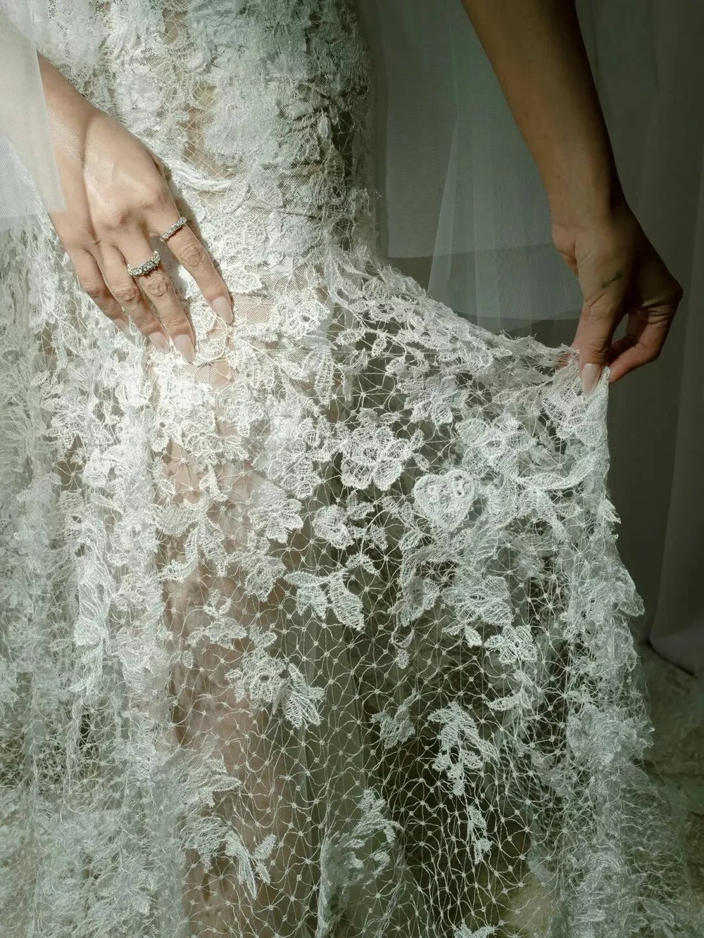 Первым нарядом стало шелковое молочное платье с открытой спиной и декольте крест-накрест, драпировкой по всей длине и рюшами на воротнике. Платье дополняла полупрозрачная фата того же оттенка. Под венец Селена пошла в кружевном платье похожего кроя: именно этот образ поклонники отметили как самый запоминающийся.