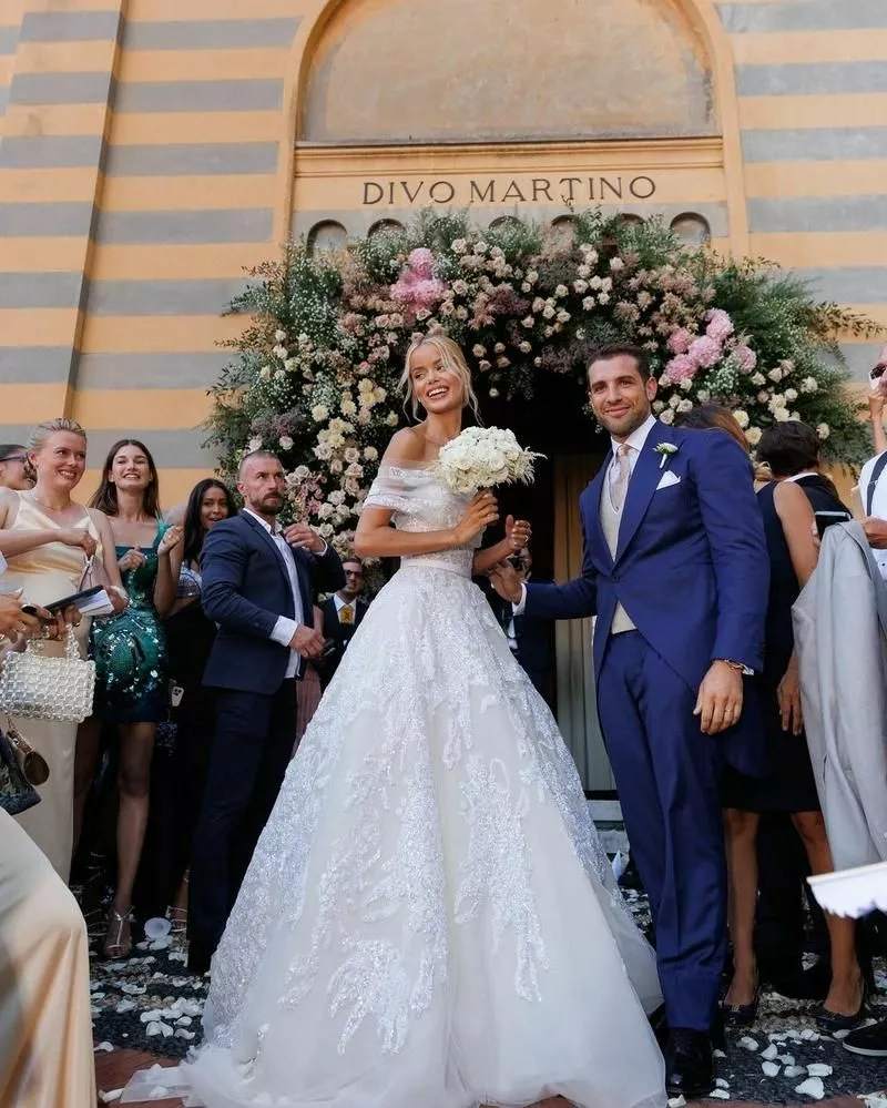Ангел Victoria’s Secret и ее избранник вслед за Кортни и Трэвисом тоже поженились в итальянском Портофино. Официальная часть бракосочетания прошла в старинной церкви Диво Мартино, после чего состоялся праздничный ужин, место проведения которого щедро задекорировали свечами и живыми цветами пастельных оттенков. Среди именитых гостей церемонии были замечены наследница империи Topshop Хлоя Грин, а также российская супермодель Наташа Поли. Фрида выглядела великолепно в кружевном подвенечном платье с блестками из новой, осенней коллекции Ellie Saab 2022 года, в окружении подружек невесты, которые облачились в солнечно-желтый.