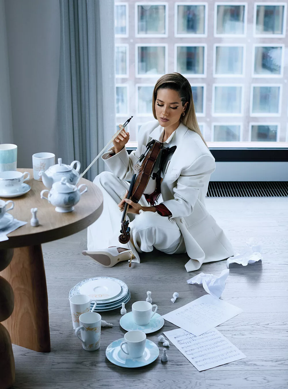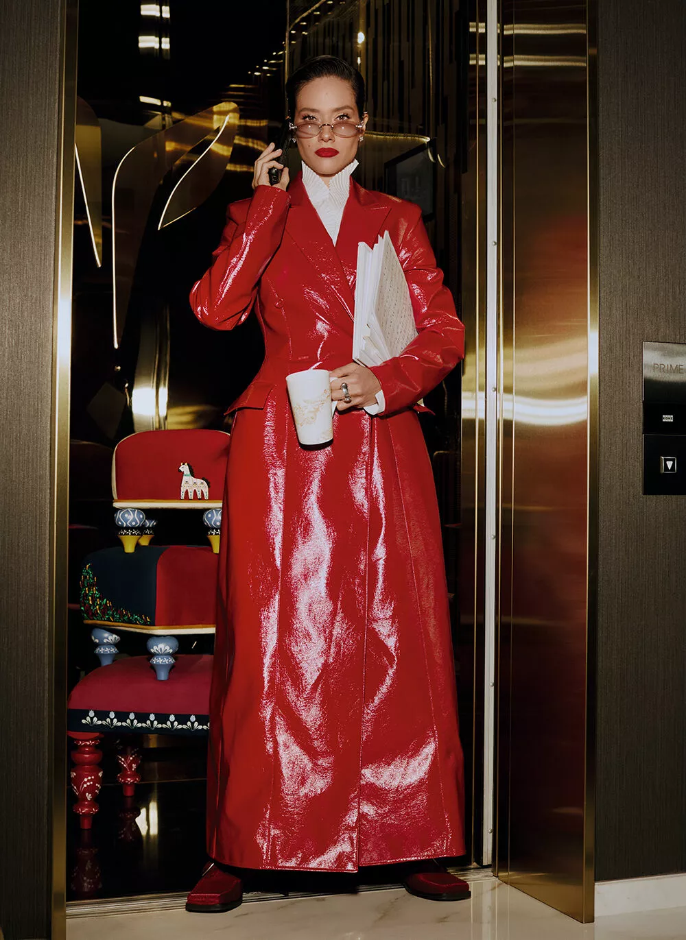 Сегодняшняя съемка — будто машина времени. Я снова вернулась то ли в 90-е, то ли в 2000-е: и на любимой скрипке поиграла, и подержала в руках городской радиотелефон — очень похожий на первую тяжелую сотовую «моторолу», которая не звонила, но носить ее в руке и изображать звонок было невыносимо прекрасно. Да и красный плащ, в котором только что блистала, — некая отсылка к фильму «Матрица», — рассуждает Юля.