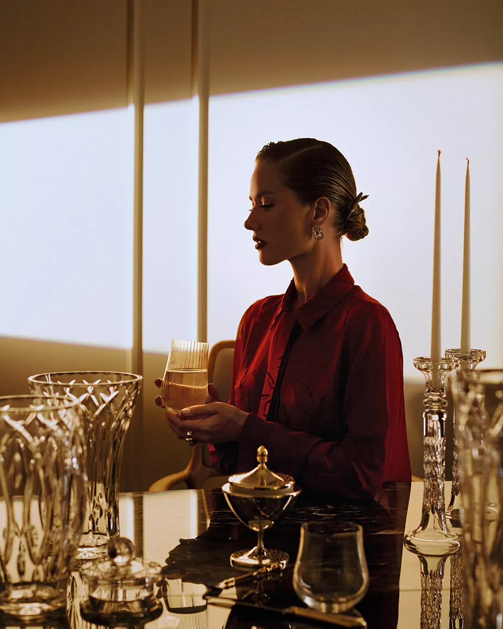 Вазы из коллекции «Хрустальный дворец», хрустальный подсвечник из коллекции «Росы», набор свечей «Вальс снежинок», стакан для воды «Вуаль», стакан для воды «Лилия», икорница из коллекции «Купель» — все «Культура Дома»