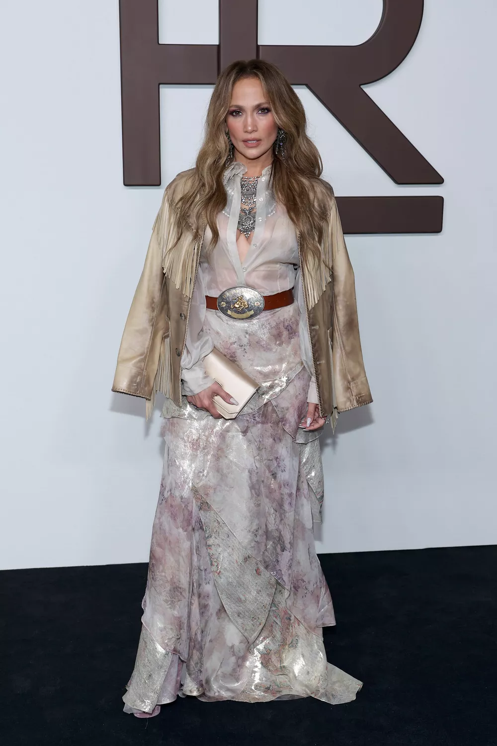 54-летняя певица сделала ставку на игривую прозрачную блузку, верхние пуговицы которой оставила не застегнутыми, многослойную юбку с цветочным принтом в пастельных тонах и бежевую куртку с бахромой. Из аксессуаров Джей Ло выбрала многослойное серебряное ожерелье в стиле бохо, коричневый ремень с большой пряжкой и золотистый металлический клатч.