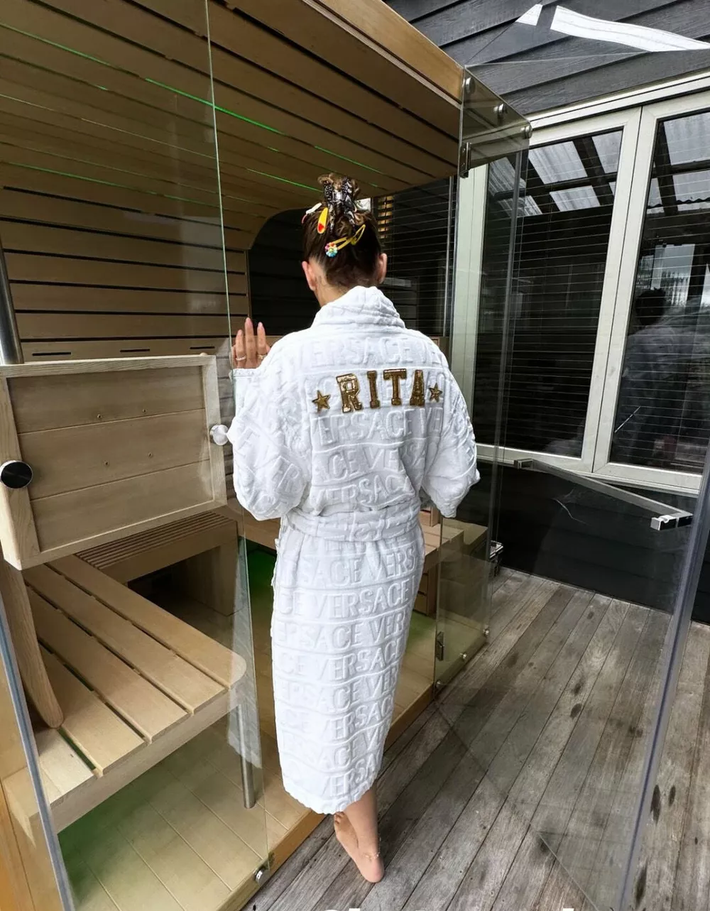 33-летняя певица выглядела потрясающе в черном раздельном купальнике, подчеркивающем достоинства ее подтянутой фигуры. После сауны Рита надела именной банный халат.