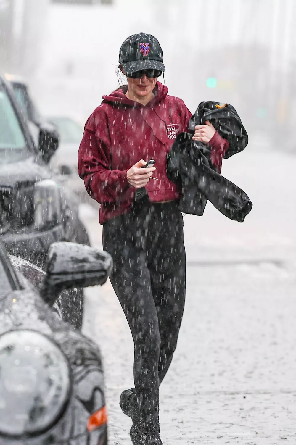Знаменитость была одета в укороченное бордовое худи, черные леггинсы и кроссовки, а также черную бейсболку с цветным лого “NY”. Похоже, дождь застал знаменитость врасплох, и она даже не успела снять солнцезащитные очки и накинуть на плечи ветровку, которую несла в руках.