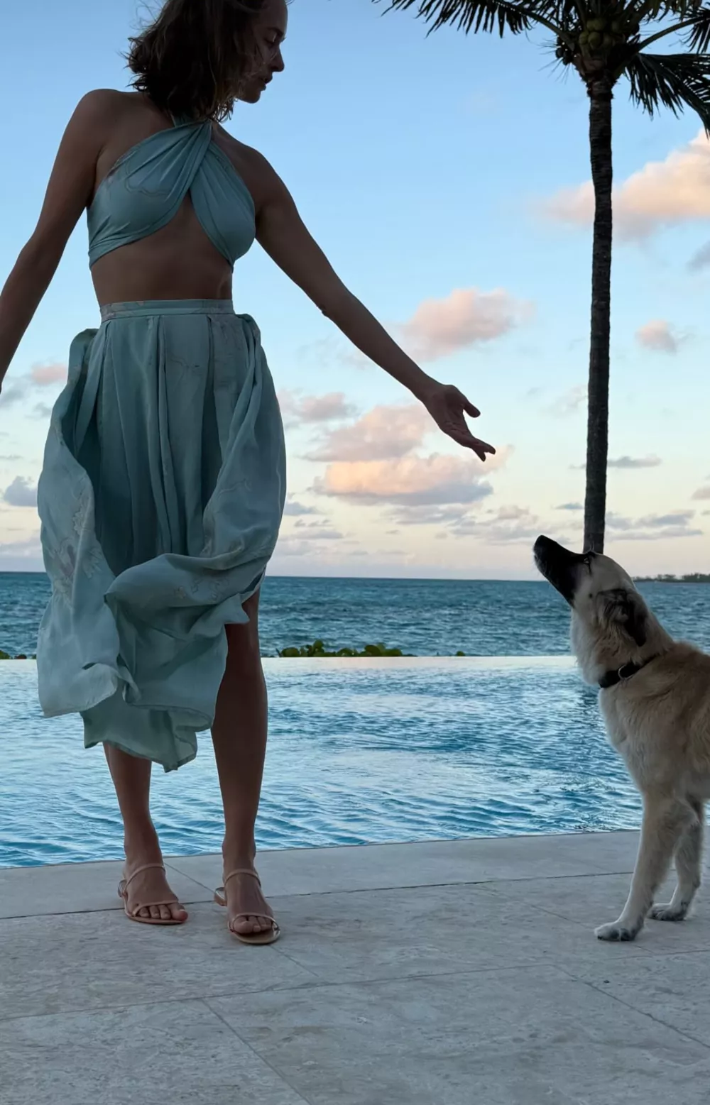 Среди других фотографий — сцены отдыха на яхте и вечерний образ Зуевой в бирюзовом костюме на фоне заката, рядом с собакой.