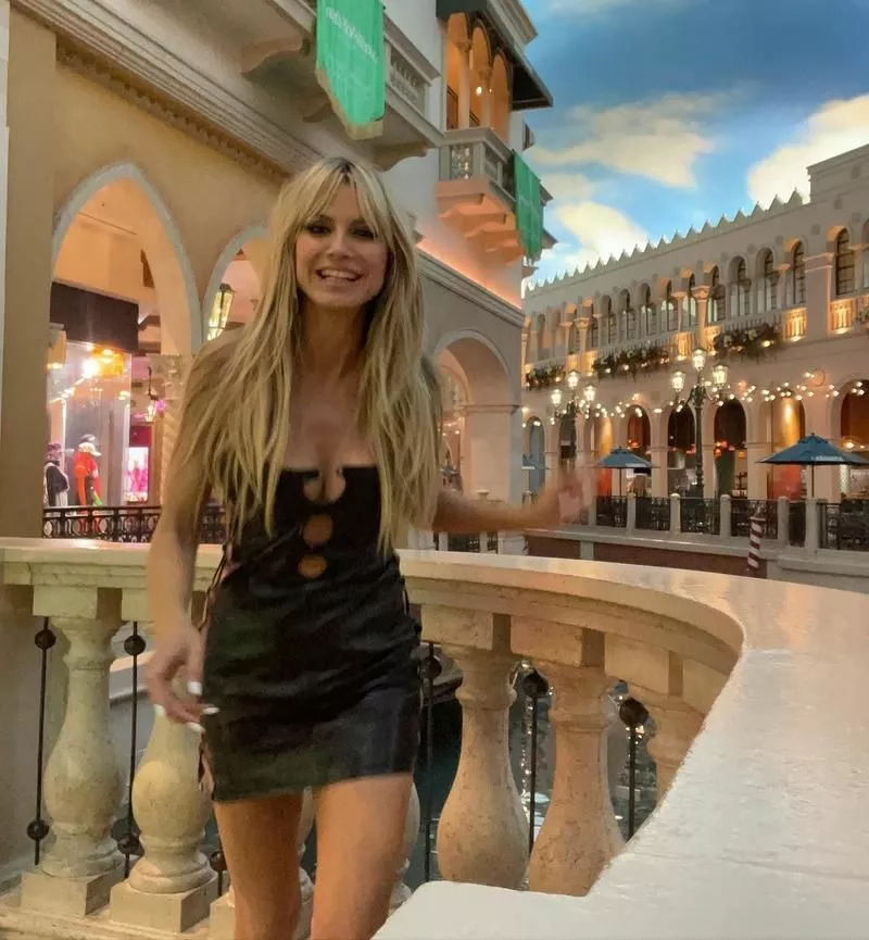 Судя по фону, супруги провели вечер в венецианском Лас-Вегасе – роскошном отеле и казино-курорте, расположенном на Лас-Вегас-Стрип в Парадайс, штат Невада. Позируя для фото, звезда подиумов и мама четверых детей продемонстрировала свою фантастическую фигуру, которую подчеркнула эффектным облегающим кожаным платьем с глубоким декольте и вырезами по бокам. Естественно уложенные локоны и подчеркнутые ресницы добавили образу небрежности.