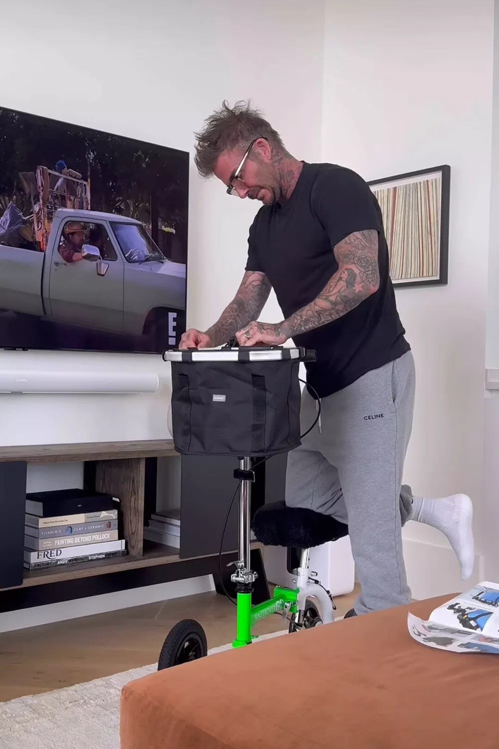 На ходунках есть мягкая платформа, предназначенная для того, чтобы человек мог опираться на нее коленом – это позволяет избежать необходимости использовать костыли или переносить вес на больную ногу. Чудо-транспорт обошелся Бекхэму в 380 долларов.